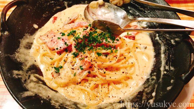 見てもわかるようと思いますが、とても濃厚なカルボナーラでモチモチのパスタにしっかり絡んで食べ応えがあります。