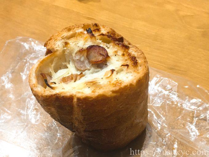 バゲットをくりぬいた中にソーセージと玉ねぎ、ベーコンのホワイトソースが入ったパンです。